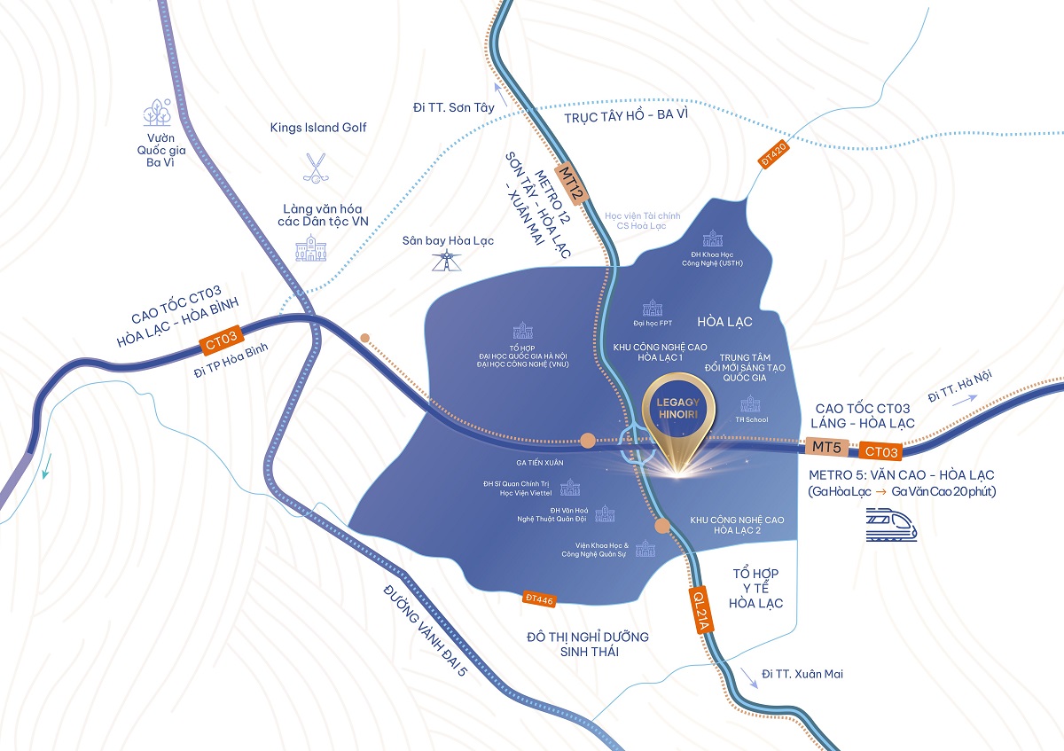 Legacy Hinoiri tọa lạc tại trung tâm khu đô thị Legacy Phú Cát – khu vực cửa ngõ phía Tây Hà Nội, thuộc vùng phát triển vệ tinh Hòa Lạc – nơi được mệnh danh là “ thung lũng silicon” của Việt Nam. Với lợi thế nằm gần các trục giao thông huyết mạch như:
